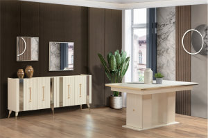 Duru Aytaşı Yemek Odası takım içeriğine Aynalı Konsol, Yemek Masası ve 6 Adet Sandalye Dahildir.