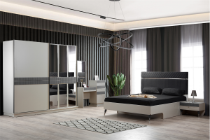 Elit Kumtaşı Yatak Odası takım içeriğine Sürgülü Dolap, Şifonyer, 2 Adet Komodin ve Bazalı Karyola Dahildir.
